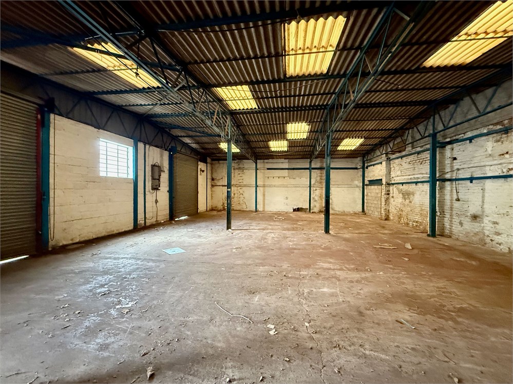 A self-contained workshop unit of traditional brick and blockwork construction under a pitched roof. The interior is open-plan with a solid concrete floor. Vehicular access is provided via two roller shutter doors, with a separate personnel door.